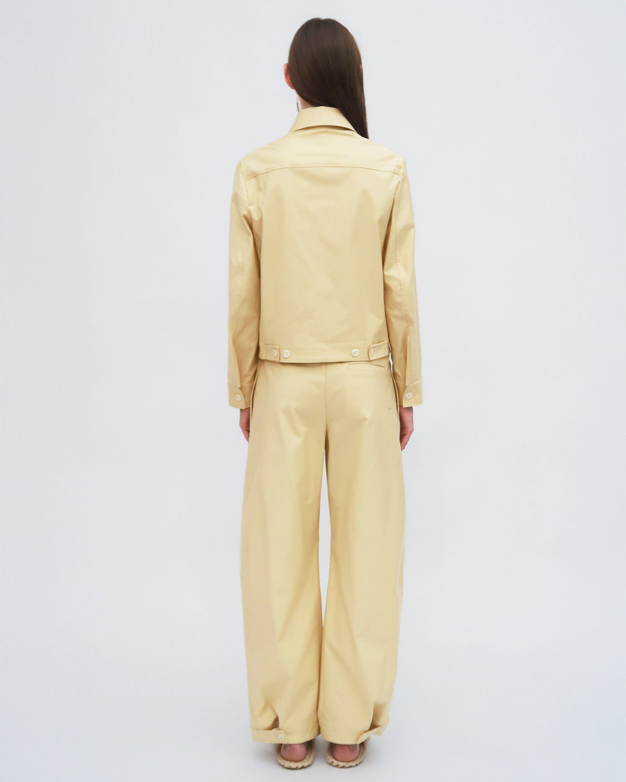 An update to a favorite shape from Resort 25, the Straight Taper Tab Pant features for the season in new slub Stretch Cotton Shantung. Designed with a self-belt at the waist, the flattering silhouette showcases refined tailored details and tiny darts at each knee.