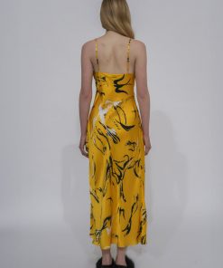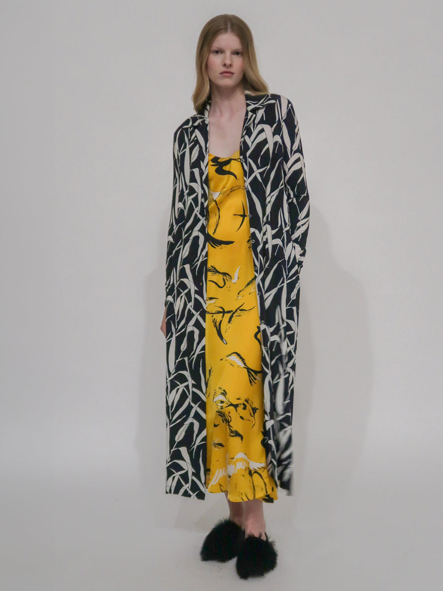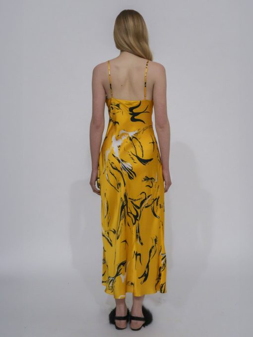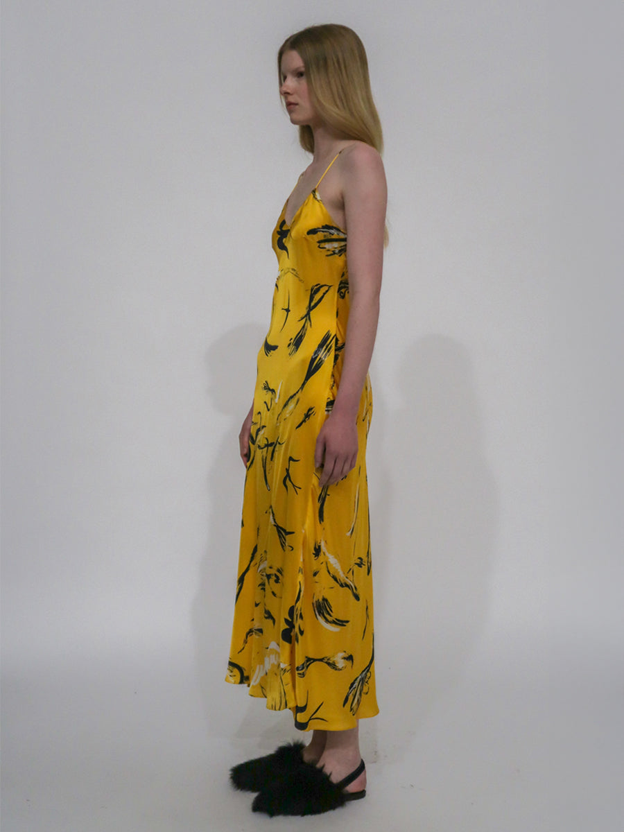 Stunning in its simplicity, this new style features a soft bias-cut slipdress silhouette rendered in whimsical Painted Birds silk-blend satin. A wardrobe powerhouse, this classic and flattering cut works well for both daytime and evening wear, shining on its own or as a foundation for knits, jackets, and more.