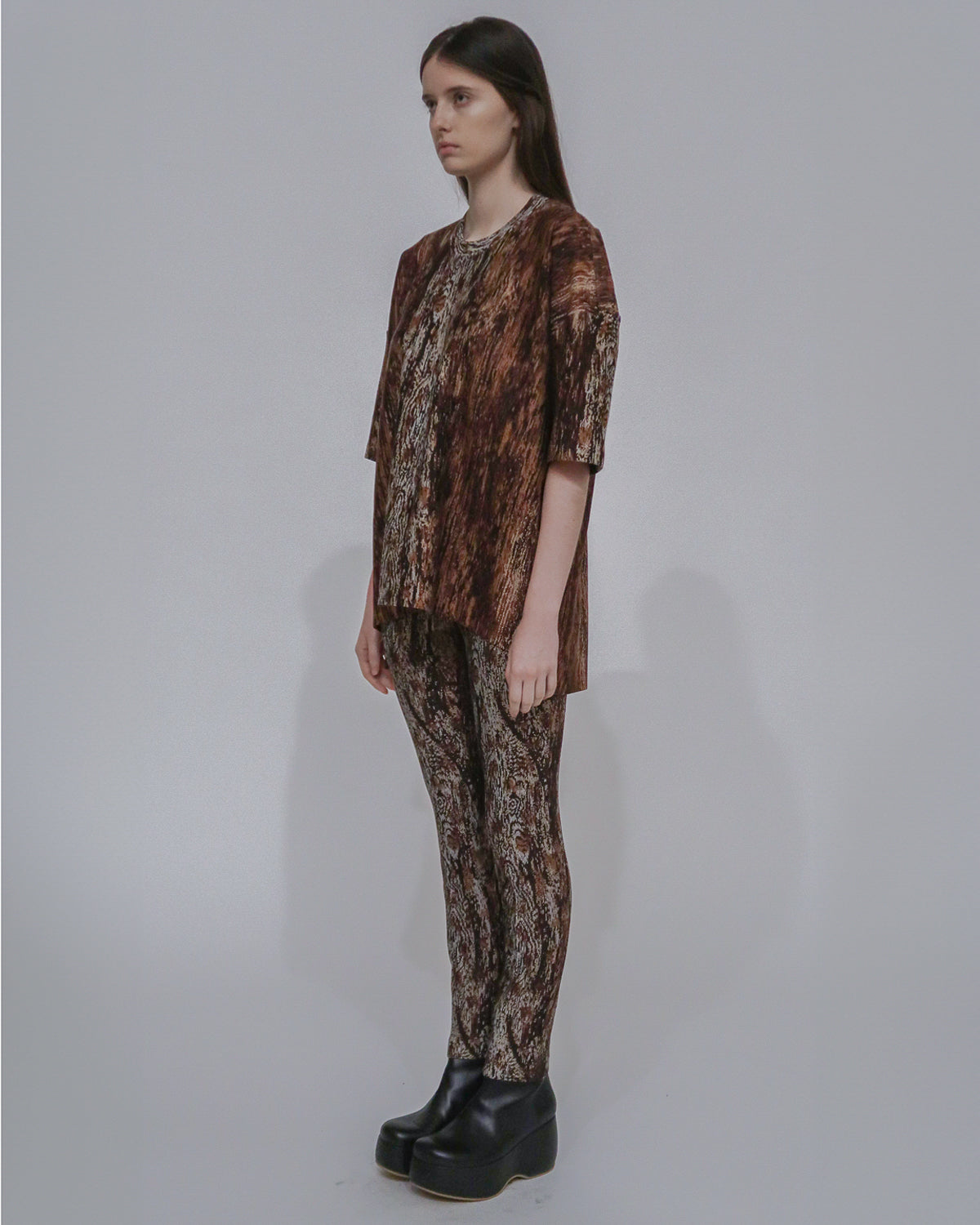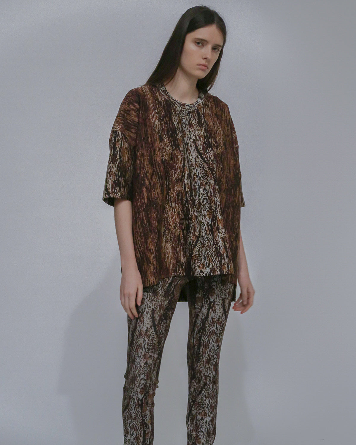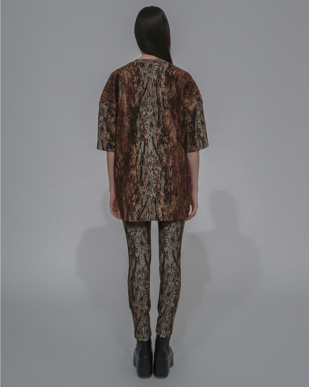 One of Rosetta’s personal favorites, the Collapsed T-Shirt, is reimagined for the Fall 24 season in new Woodgrain Interlock Jacquard. Marrying the relaxed, casual shape with the more substantial fabric lends polish to the style—elevating it for versatile day or evening wear.