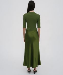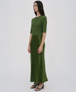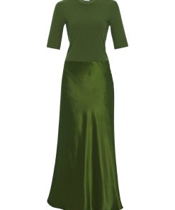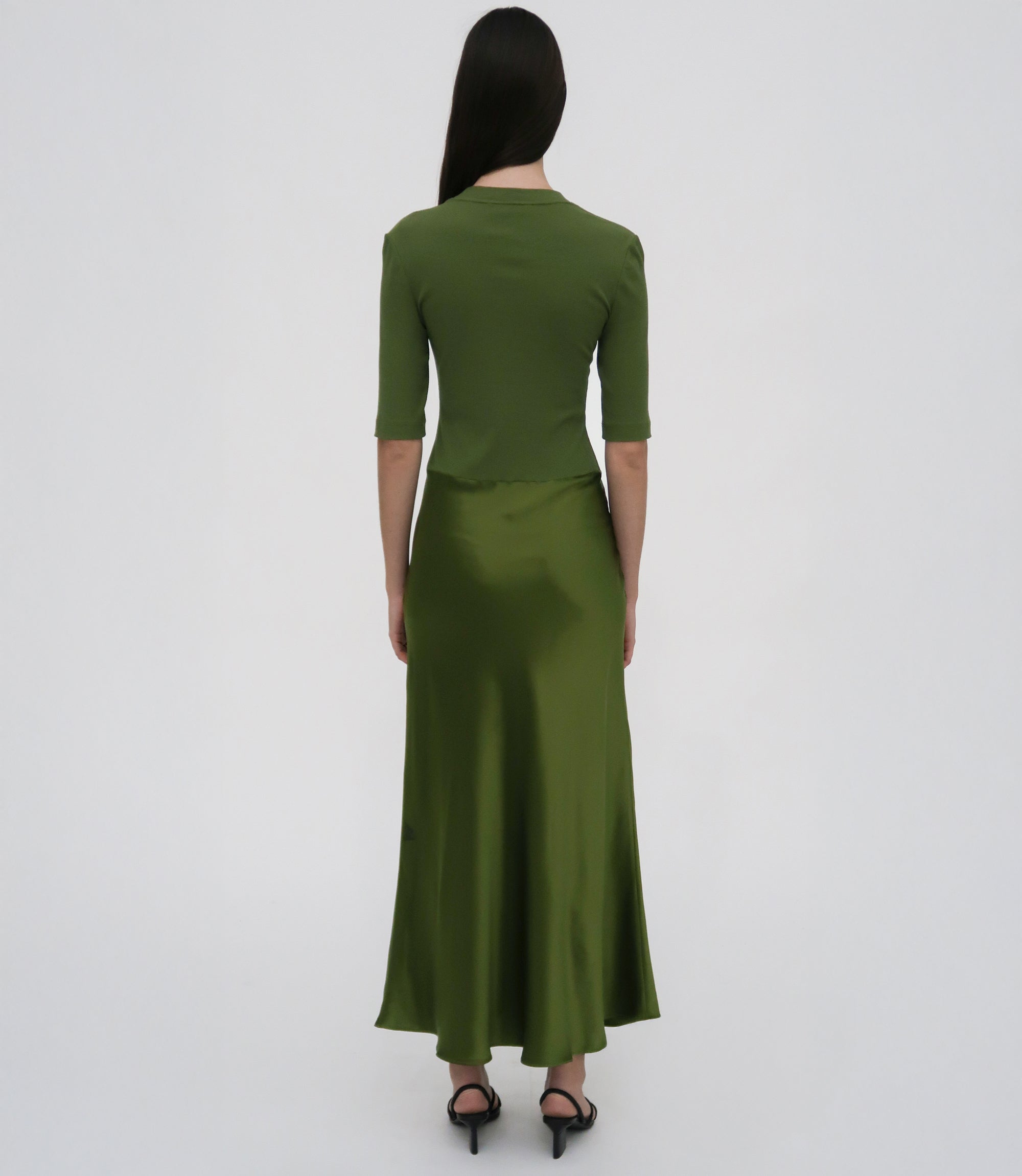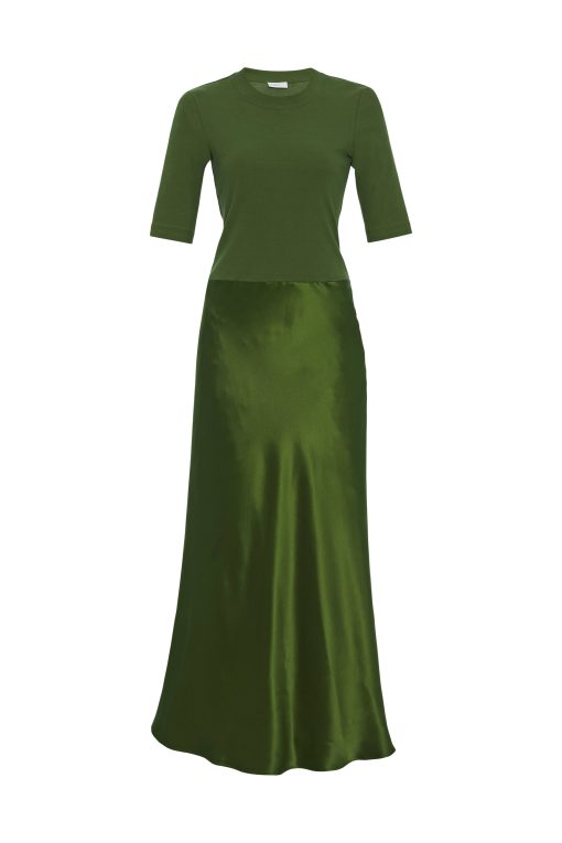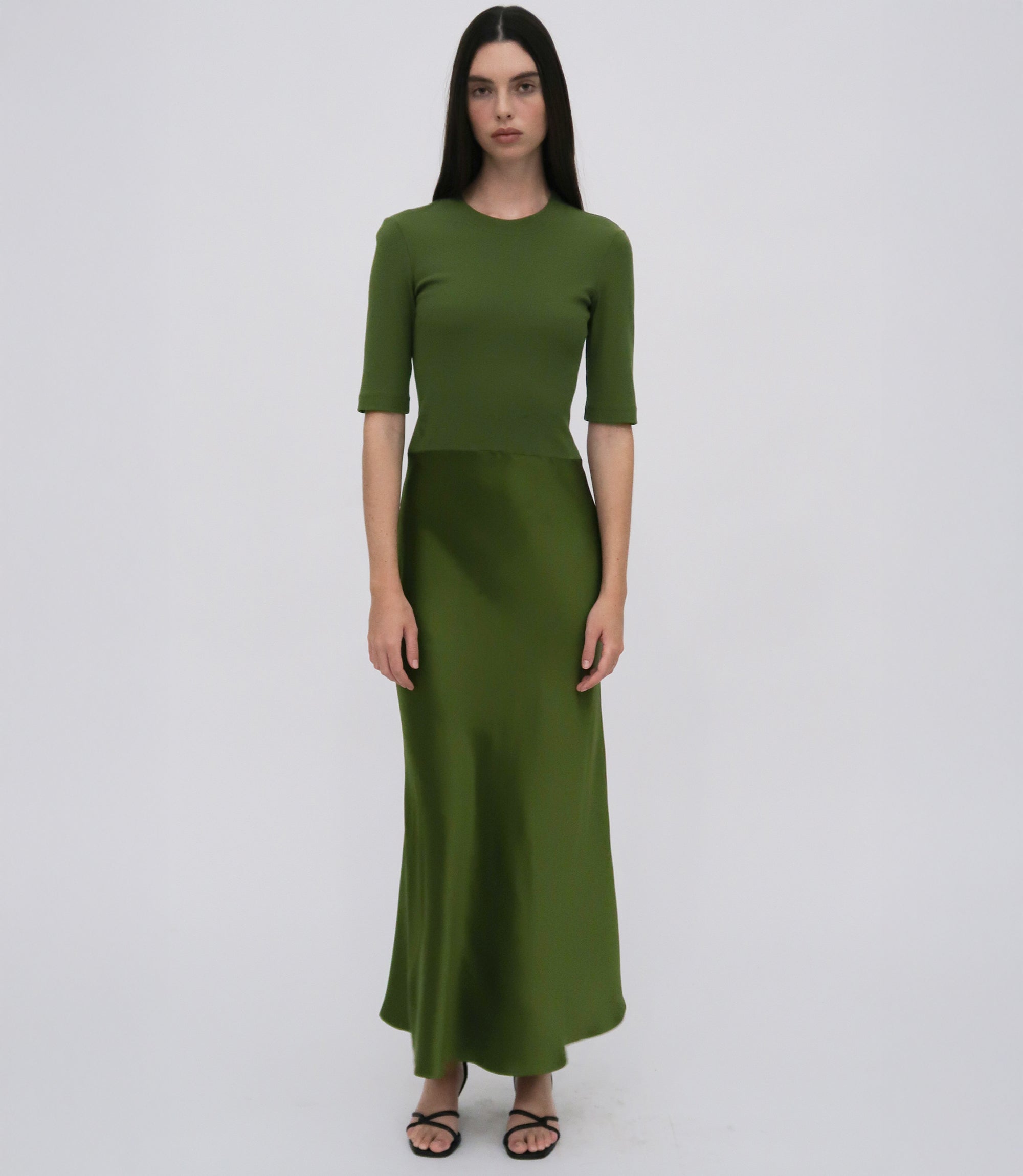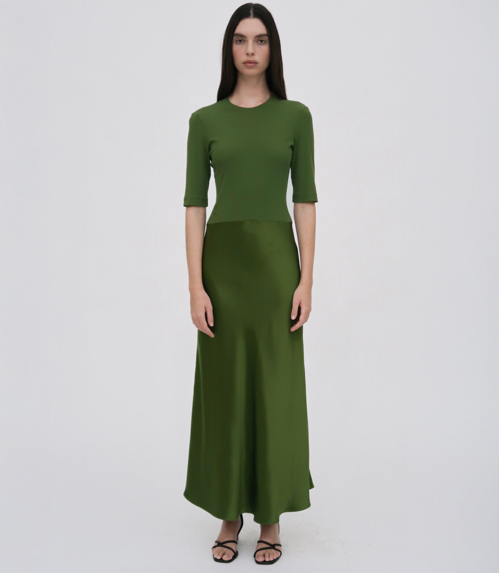 An exciting addition to the favorite Mercerized Cotton Rib Jersey capsule, the Combo T-Shirt Dress elevates the now classic Cropped Sleeve T-Shirt. Featuring an attached bias-cut midi skirt in luxe Silk Satin, it offers unexpected comfort and ease whilst being inherently elegant and refined.