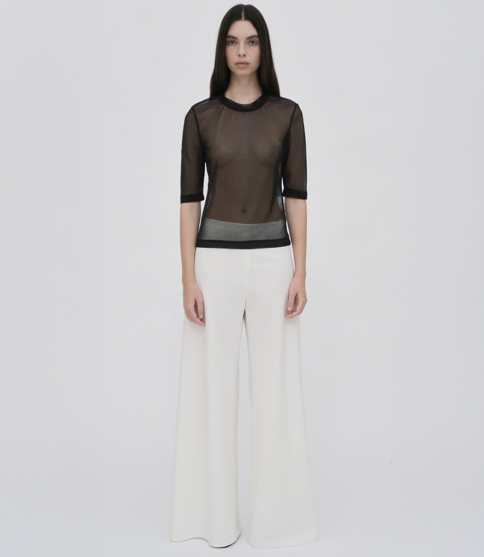 Pre-Fall 25’s new Sheer Jersey is designed for layering, reimagining our signature T-shirt silhouette. The transparent fabric is an airy contrast to the flattering style, an elevated version of the wardrobe- essential crewneck T-shirt. Cut close to the body, it has a versatile silhouette with fitted sleeves that hit just above the elbow.