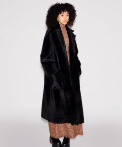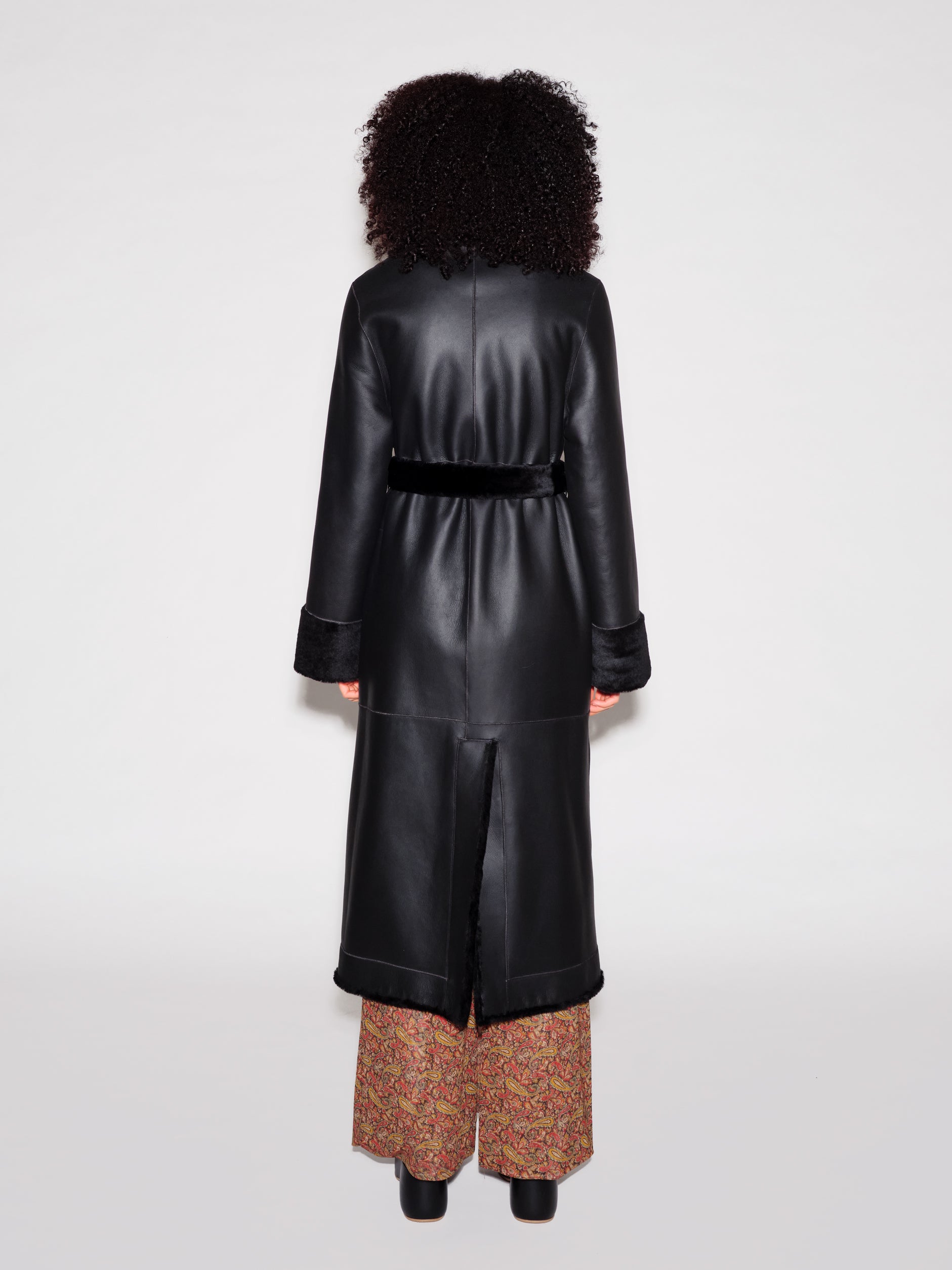Crafted of plush shearling, our luxe coat is a cold-weather dream: it is fully reversible from fur to leather for convertible wear. Cut to an oversized double-breasted silhouette, it hits at the mid-calf and features a self-tie belt for a cozy fit.