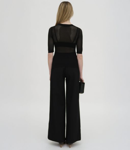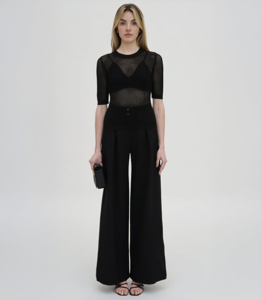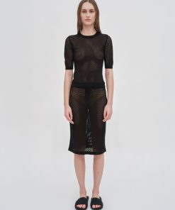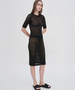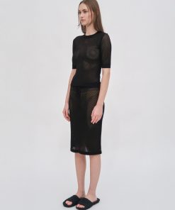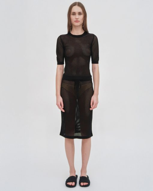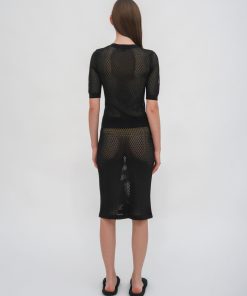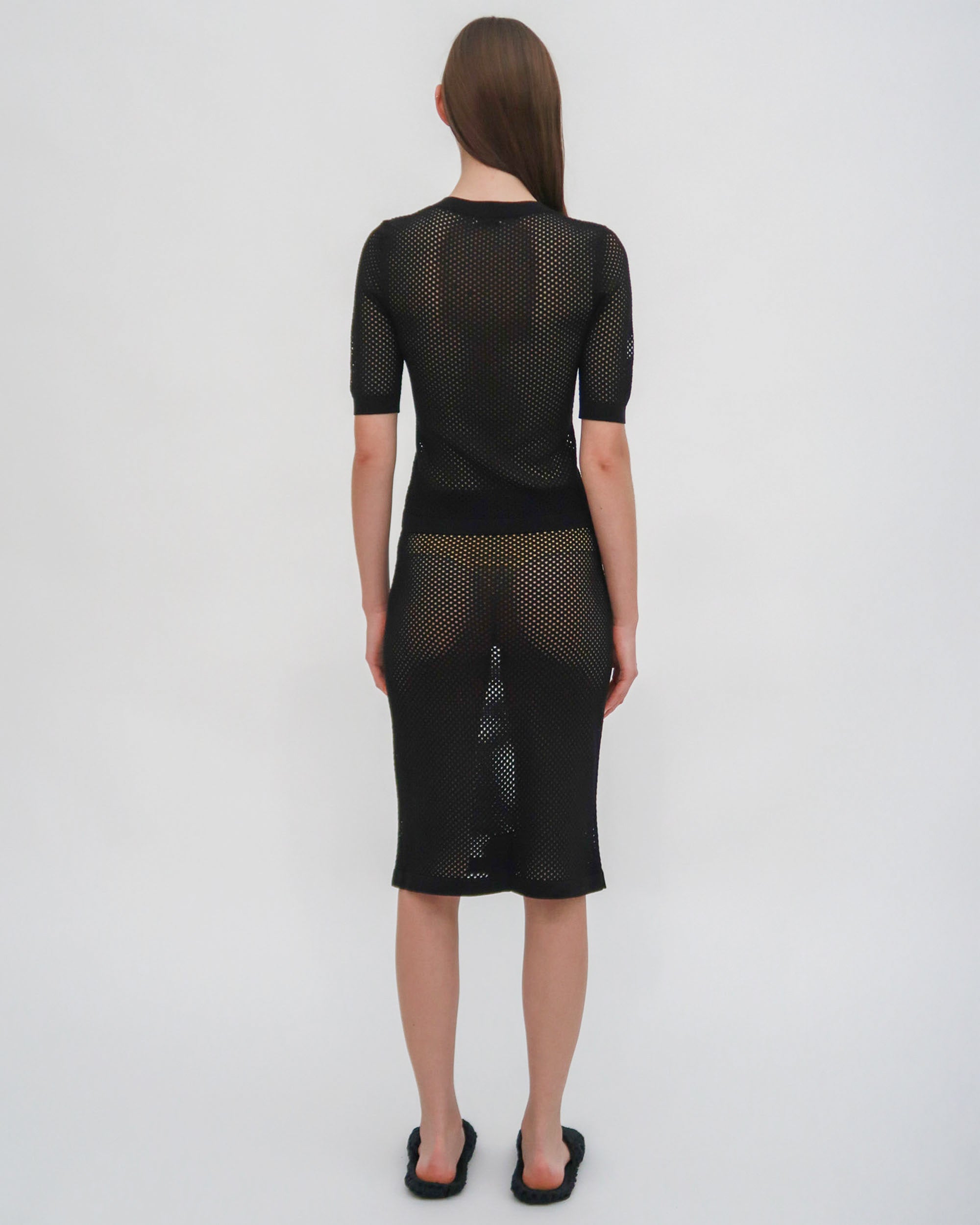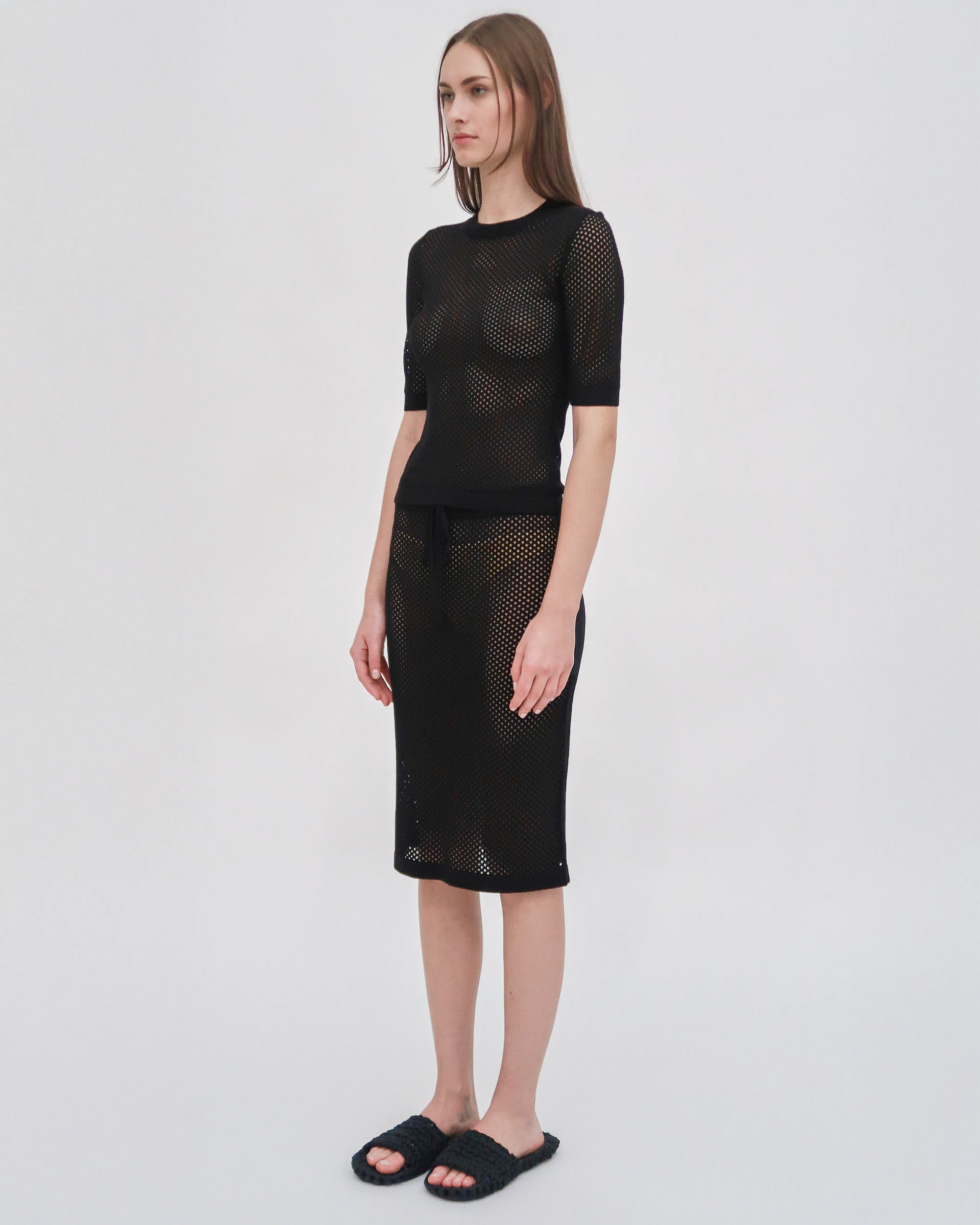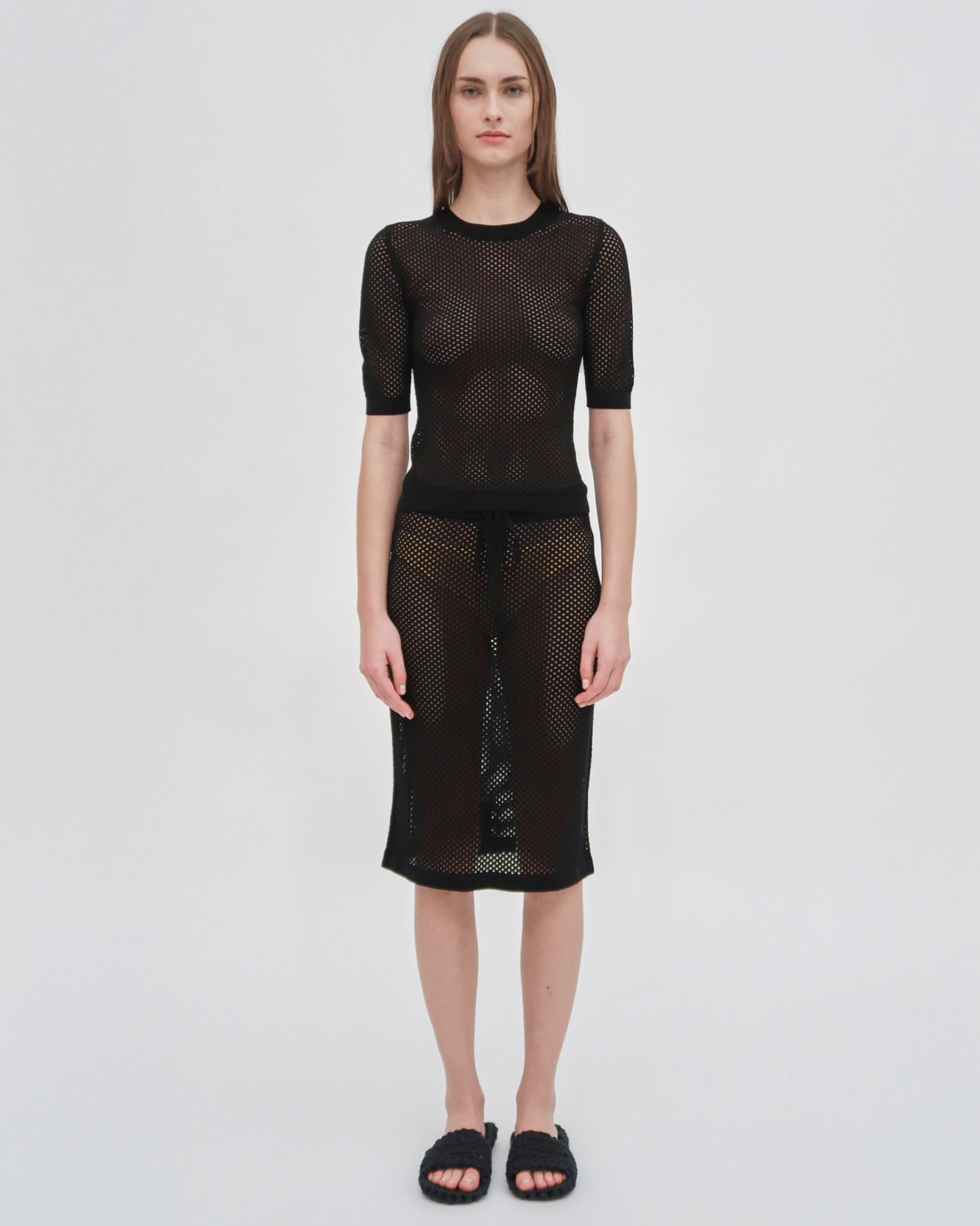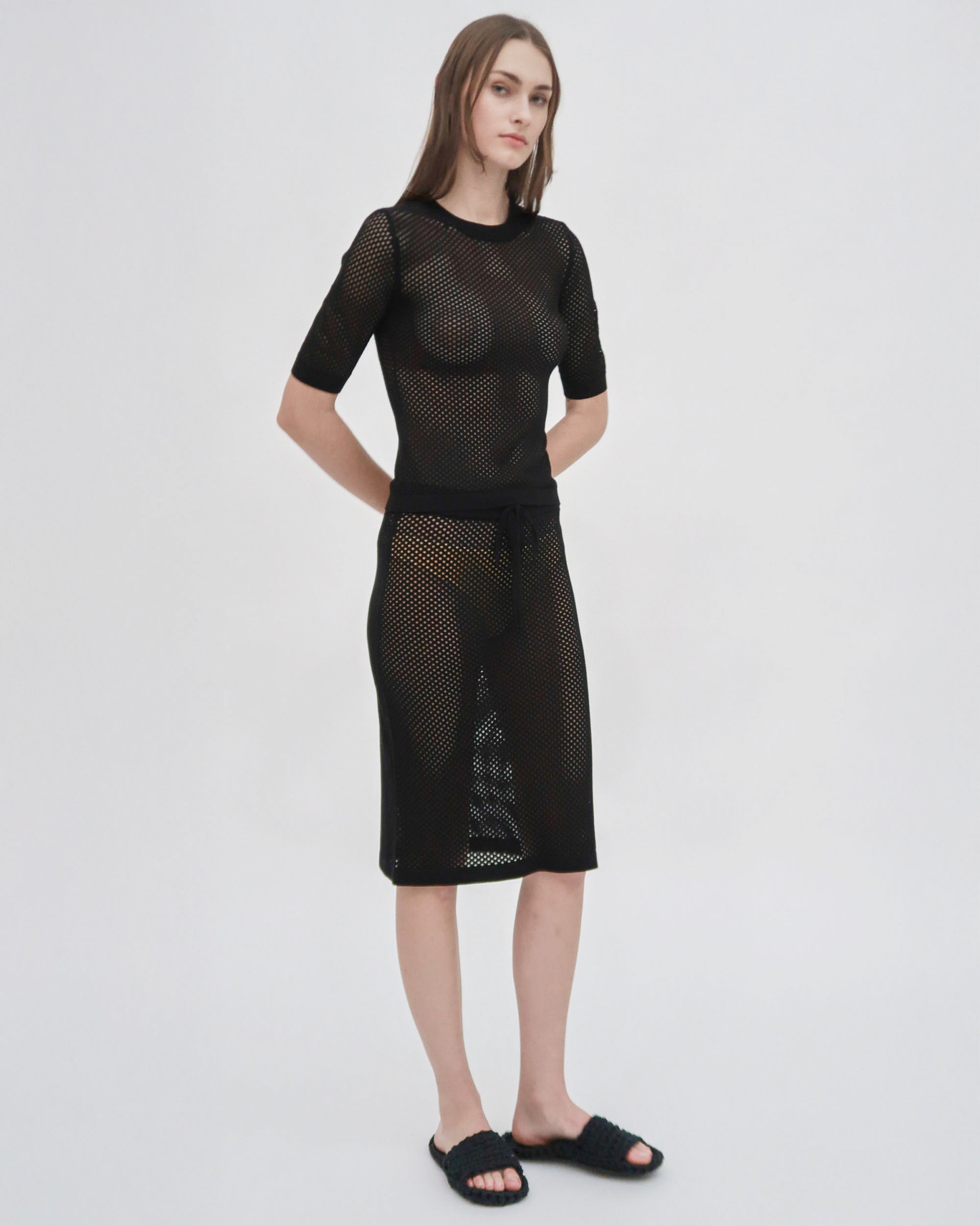 A signature Rosetta Getty silhouette is reimagined for Spring 25 with a knitted open mesh finish. Showcasing a delicate feel, the style is transparent when worn independently but becomes opaque when layered beneath the coordinating cardigan.