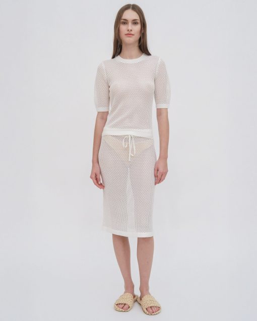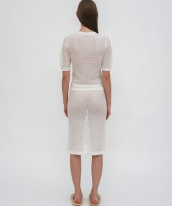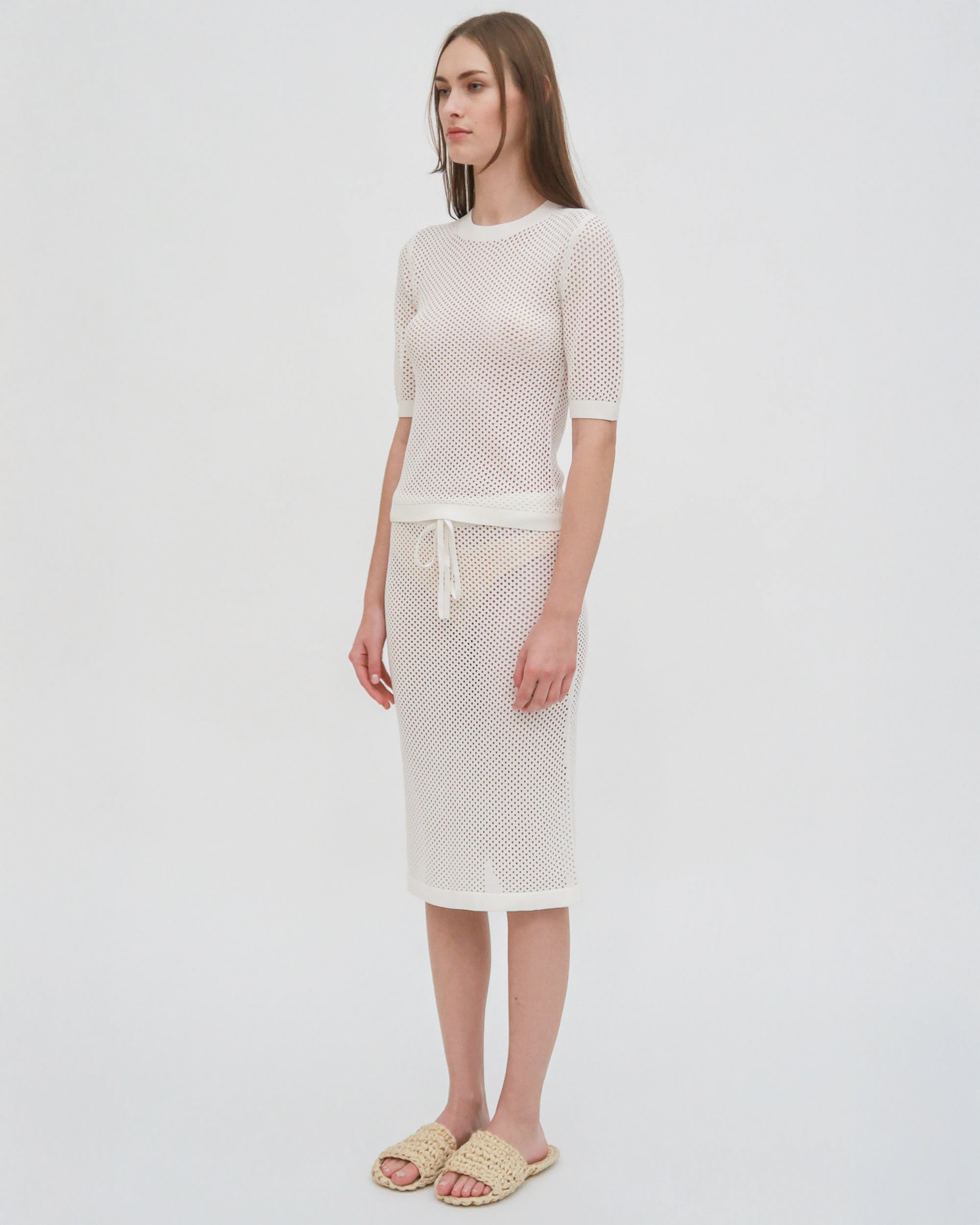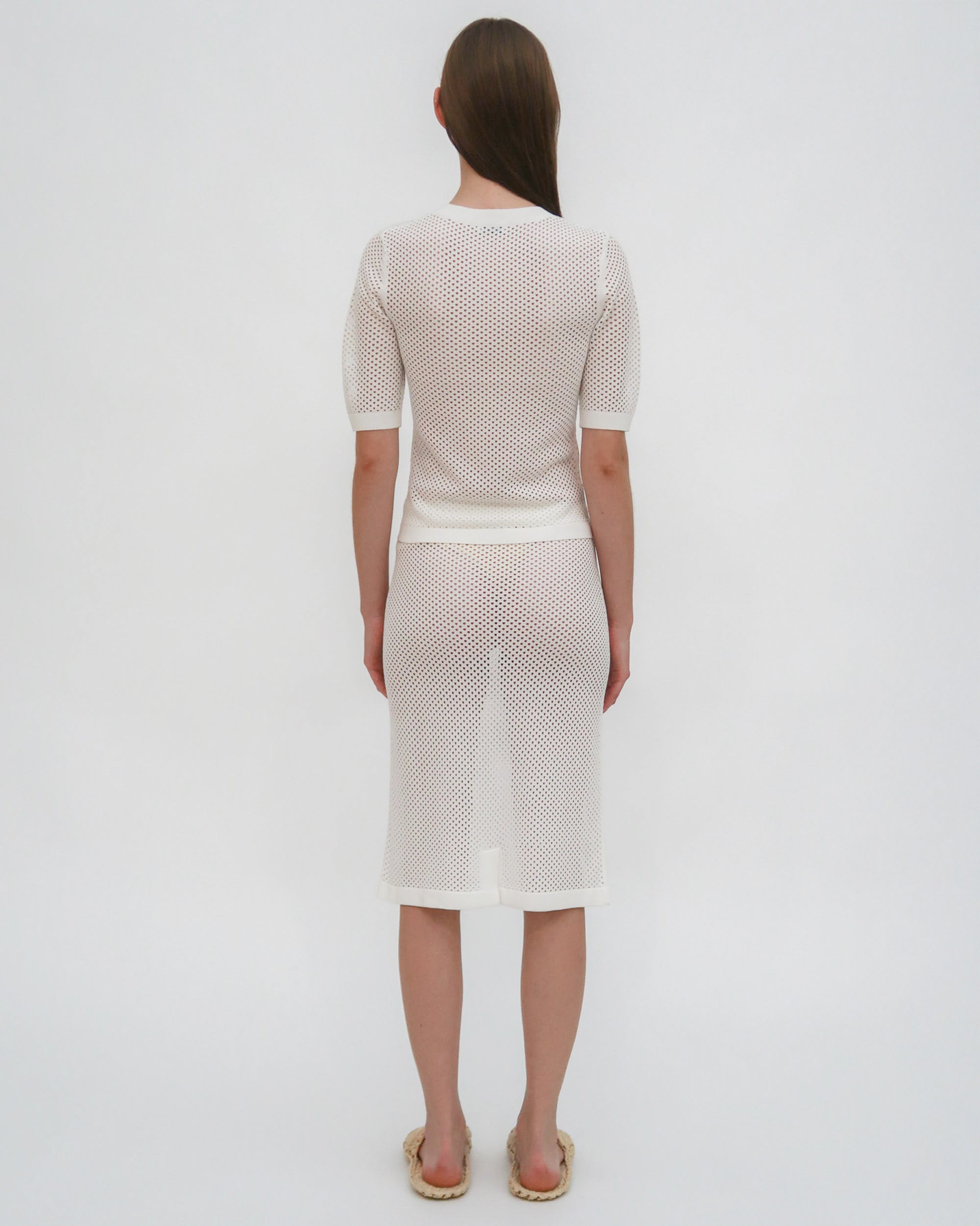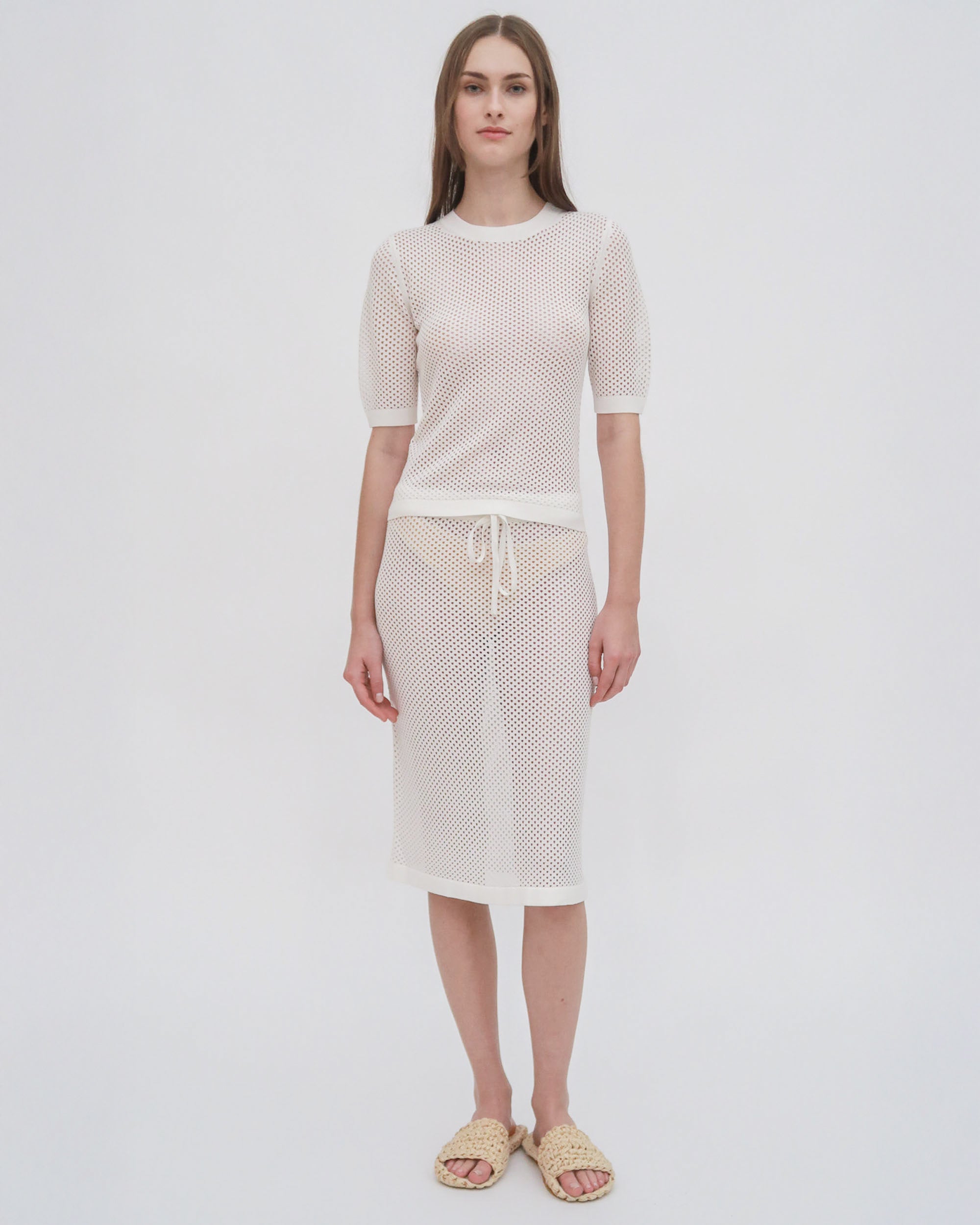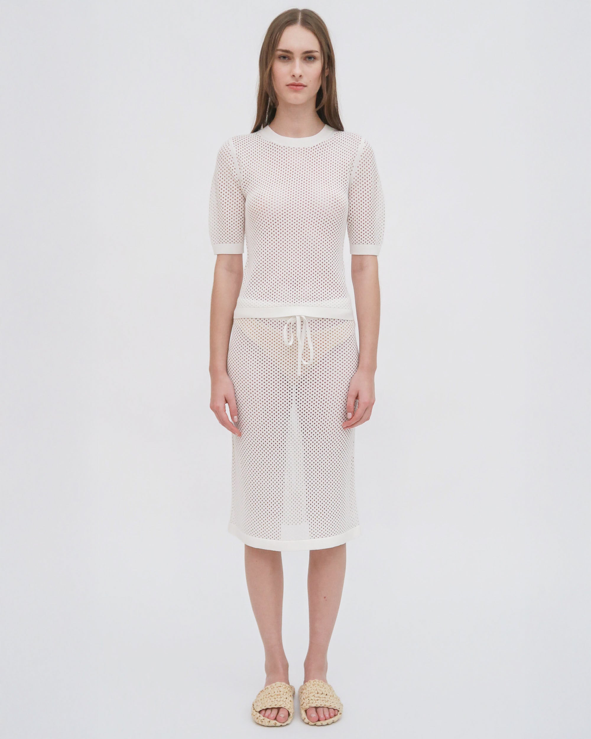 A signature Rosetta Getty silhouette is reimagined for Spring 25 with a knitted open mesh finish. Showcasing a delicate feel, the style is transparent when worn independently but becomes opaque when layered beneath the coordinating cardigan.