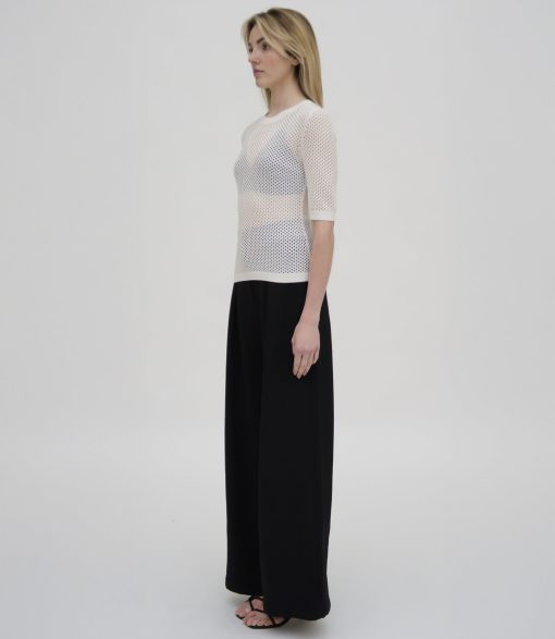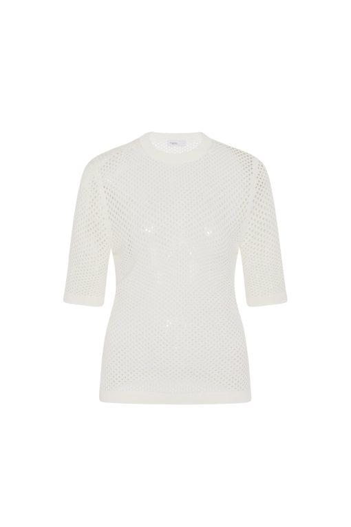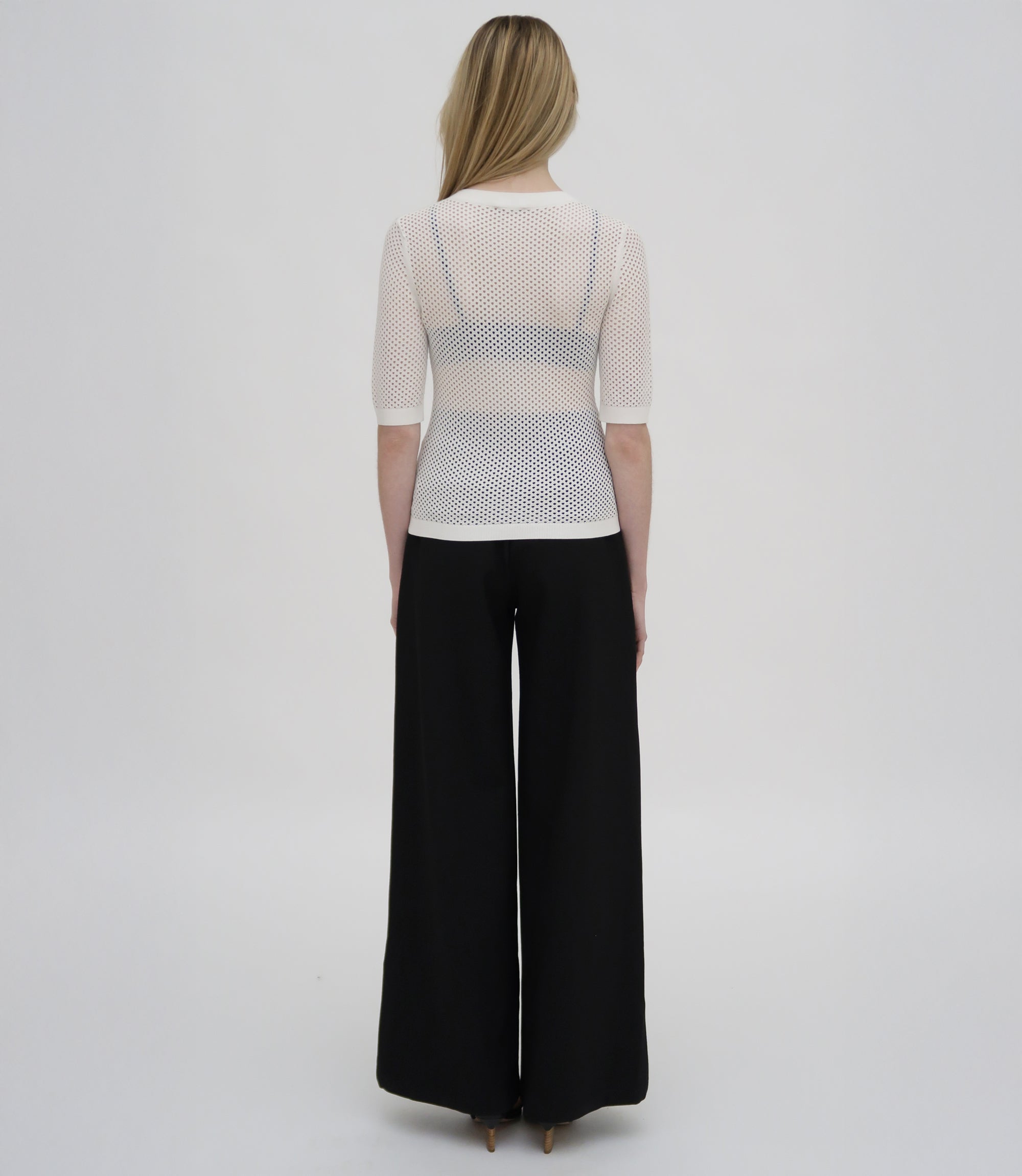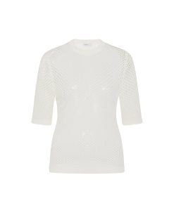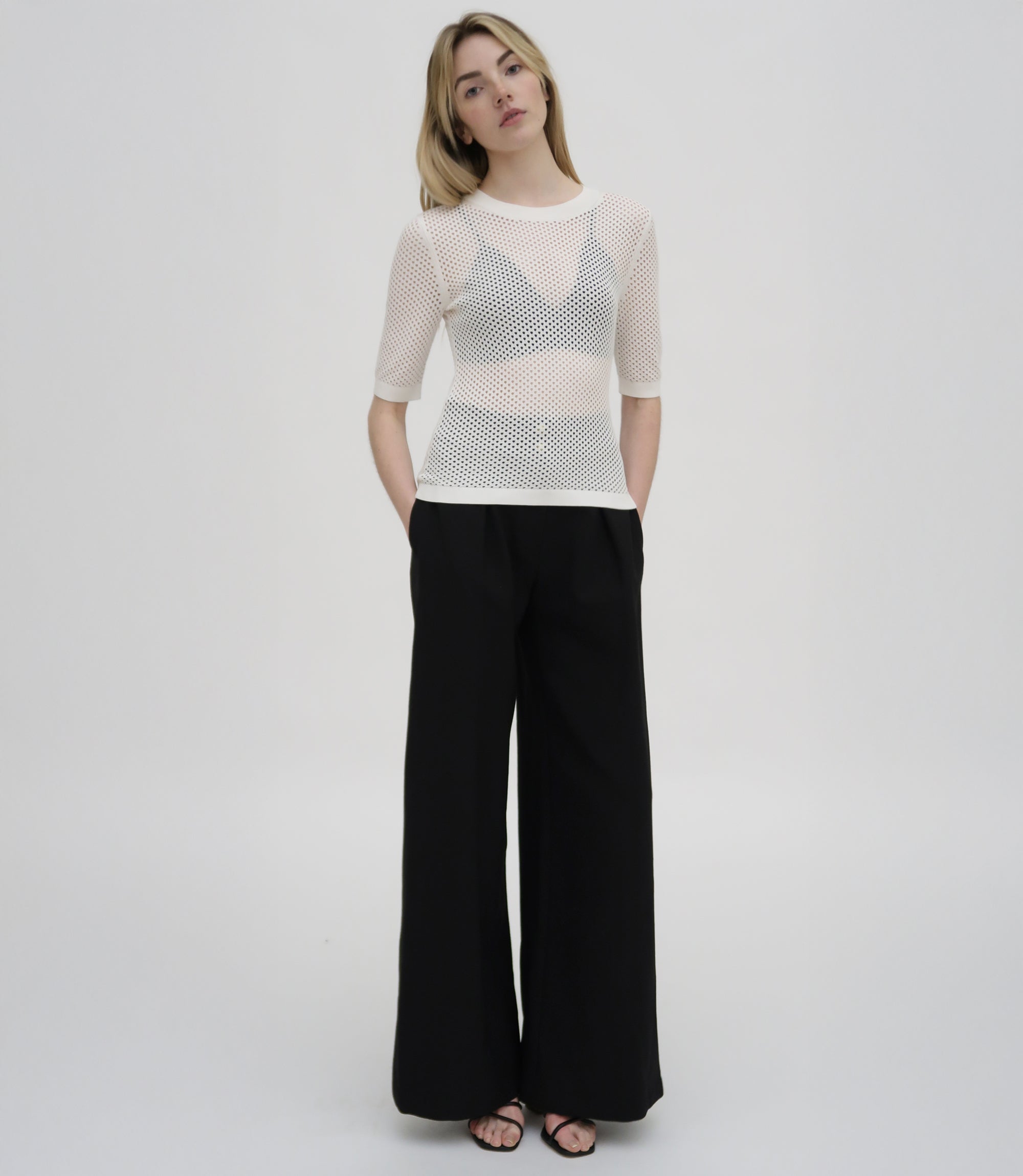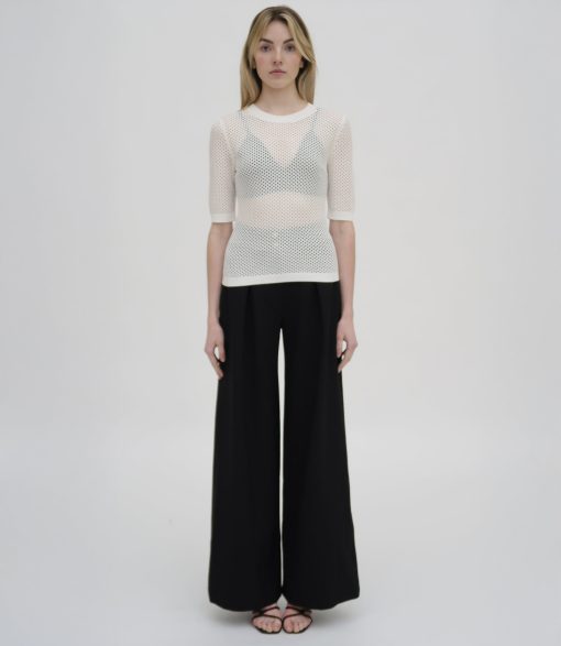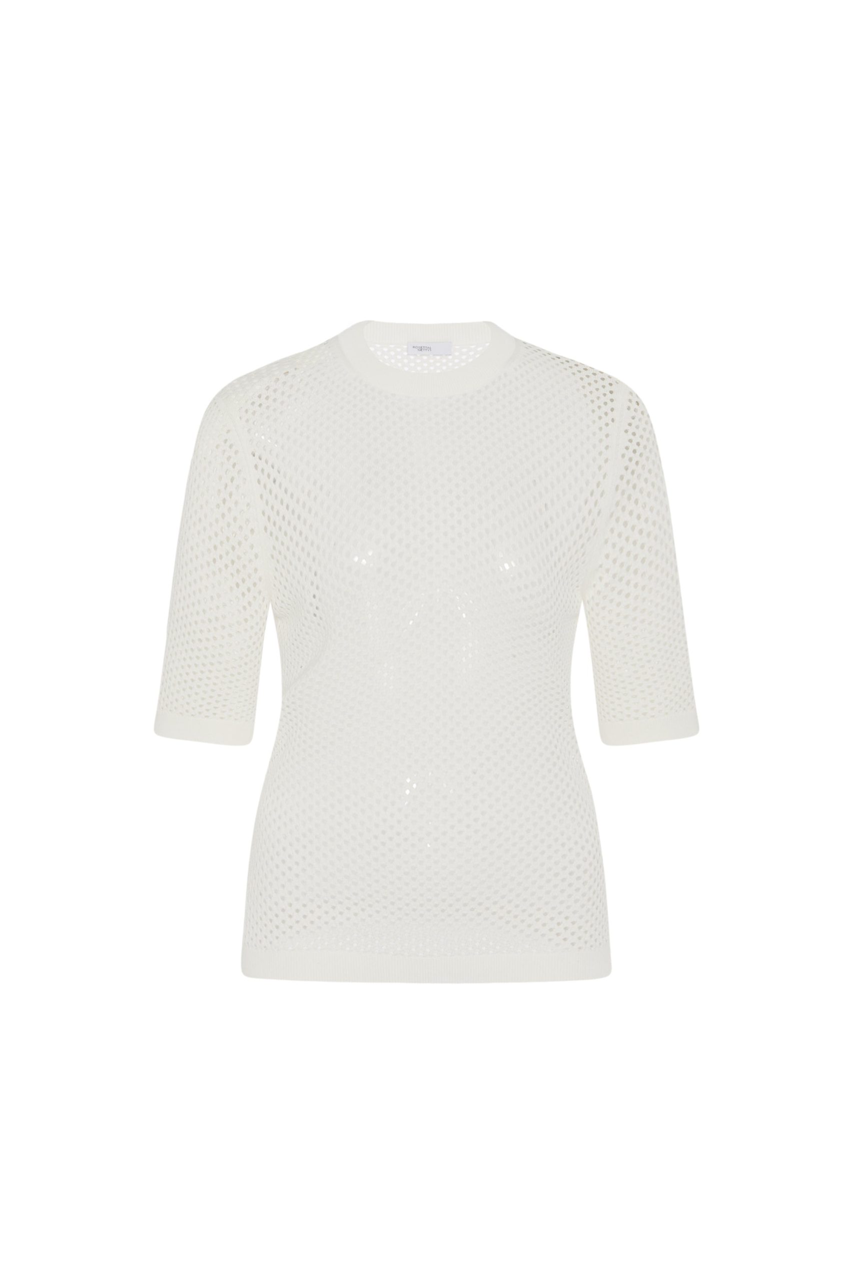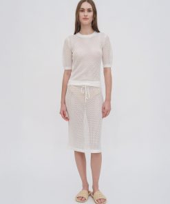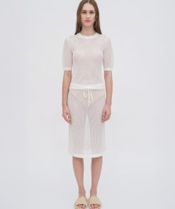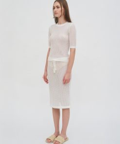 A signature Rosetta Getty silhouette is reimagined for Spring 25 with a knitted open mesh finish. Showcasing a delicate feel, the style is transparent when worn independently but becomes opaque when layered beneath the coordinating cardigan.