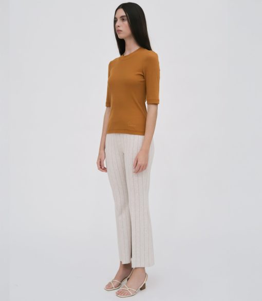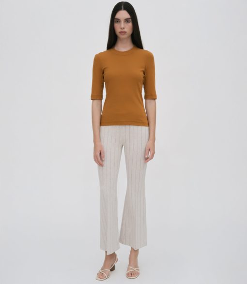 Crafted in the seasonal Pinstripe Interlock Jacquard, this signature pant is designed to flatter the body with a mid-rise and flared leg. Rosetta Getty’s special fabric and the elasticized waist impart ease to the cropped silhouette.