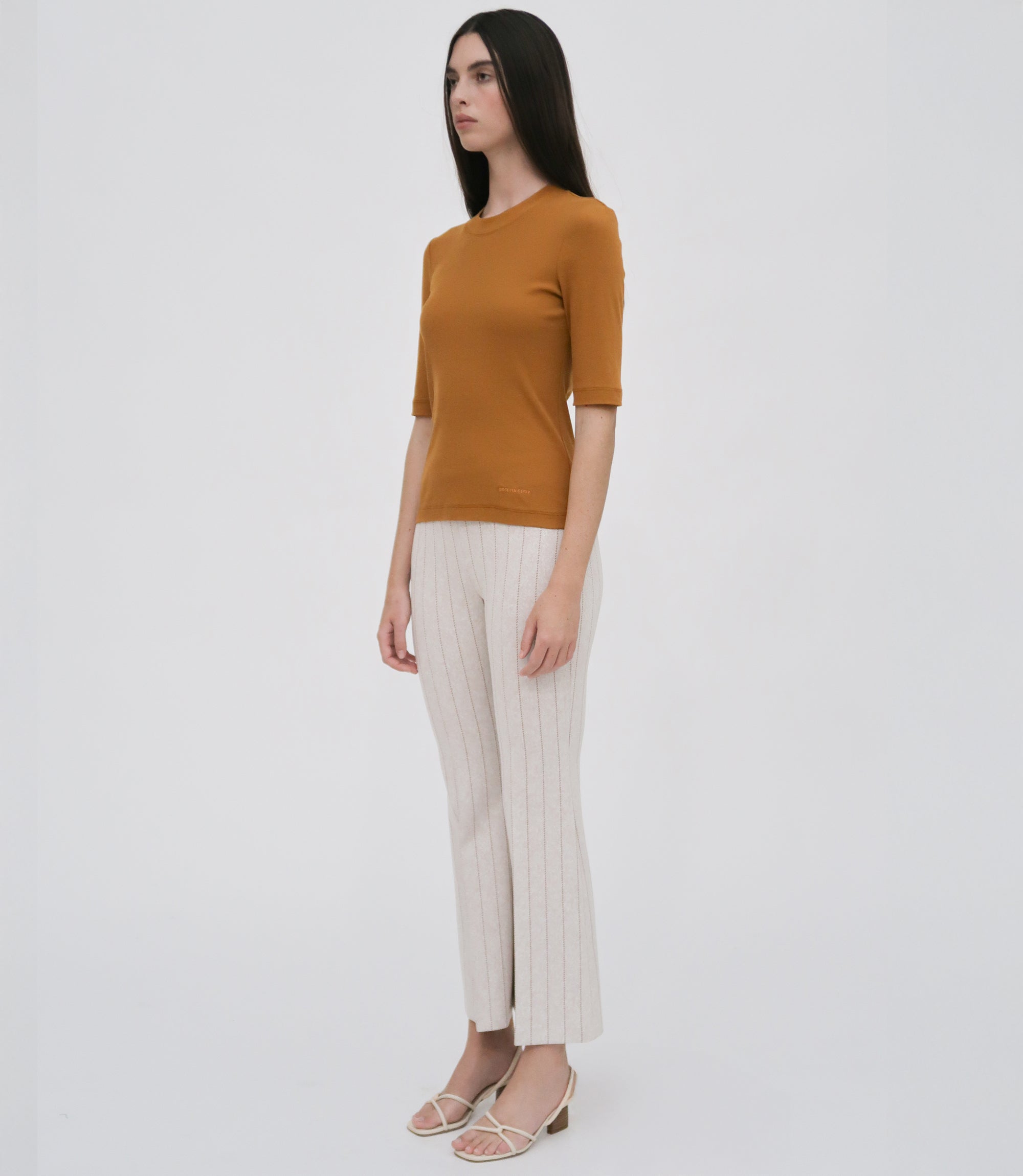An exclusive fabrication for the season, the Pinstripe Interlock Jacquard is similar to Rosetta Getty’s signature Interlock Jersey, which has a slightly slick hand and added elastic to contour the body. It’s produced by an Italian mill certified for its sustainable practices by the Associazione Tessile e Salute (Health and Textiles Association) and Forest Stewardship Council (FSC), which uses viscose produced using sustainably sourced and certified FSC wood pulp.