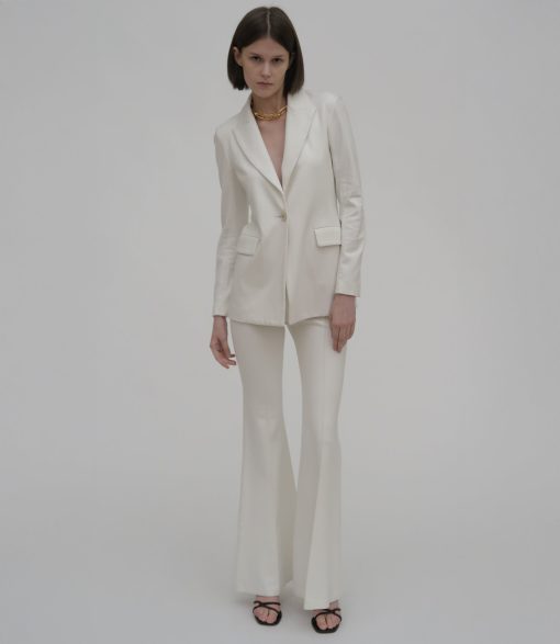 Crafted to flatter and elongate the body, this fluid pant flares gently from the knee, creating a long and lean silhouette from hip to hem. Pintuck seaming down the front and back lengthens further, while the elasticized mid-rise waist enhances the ease of wear.
