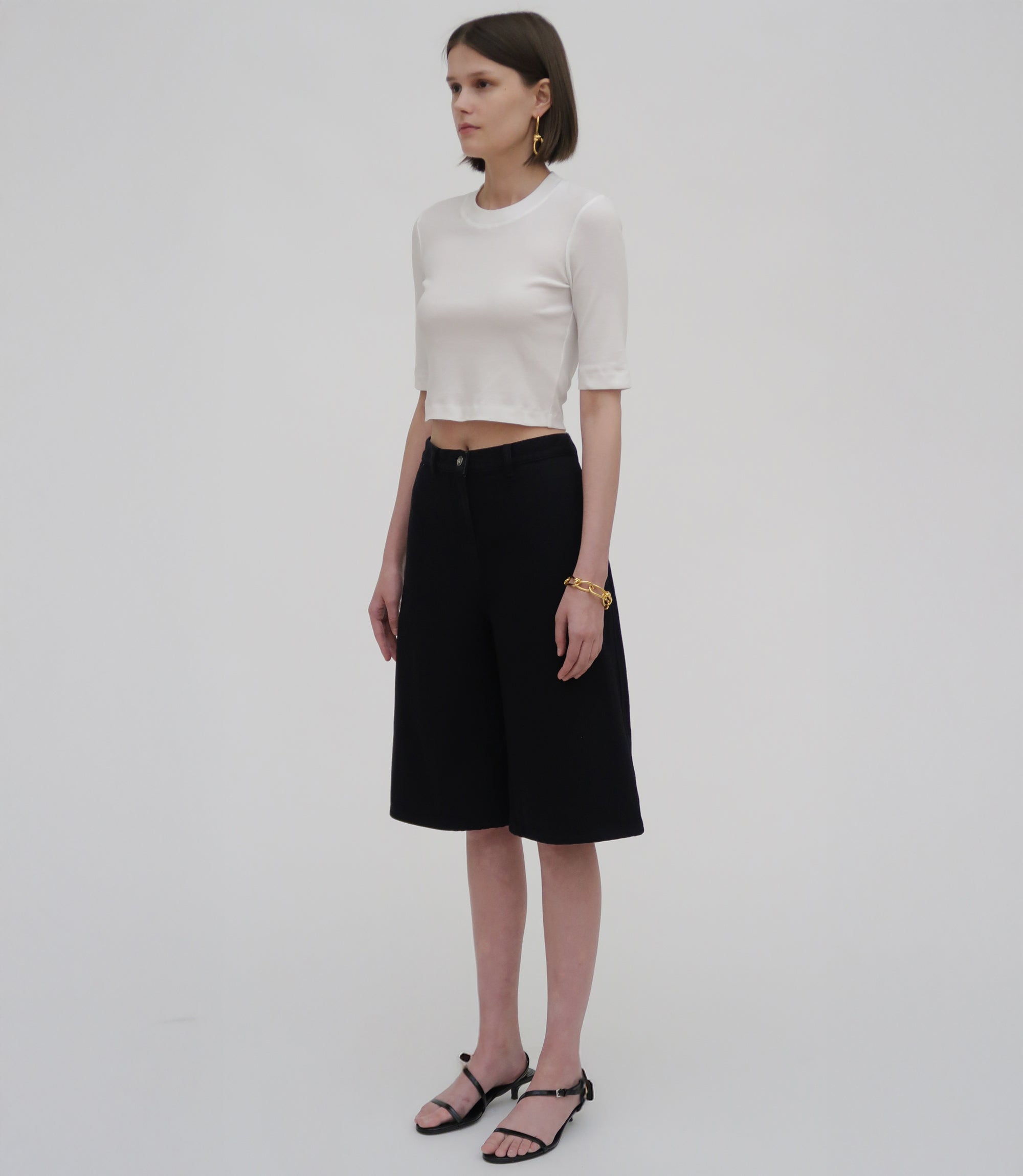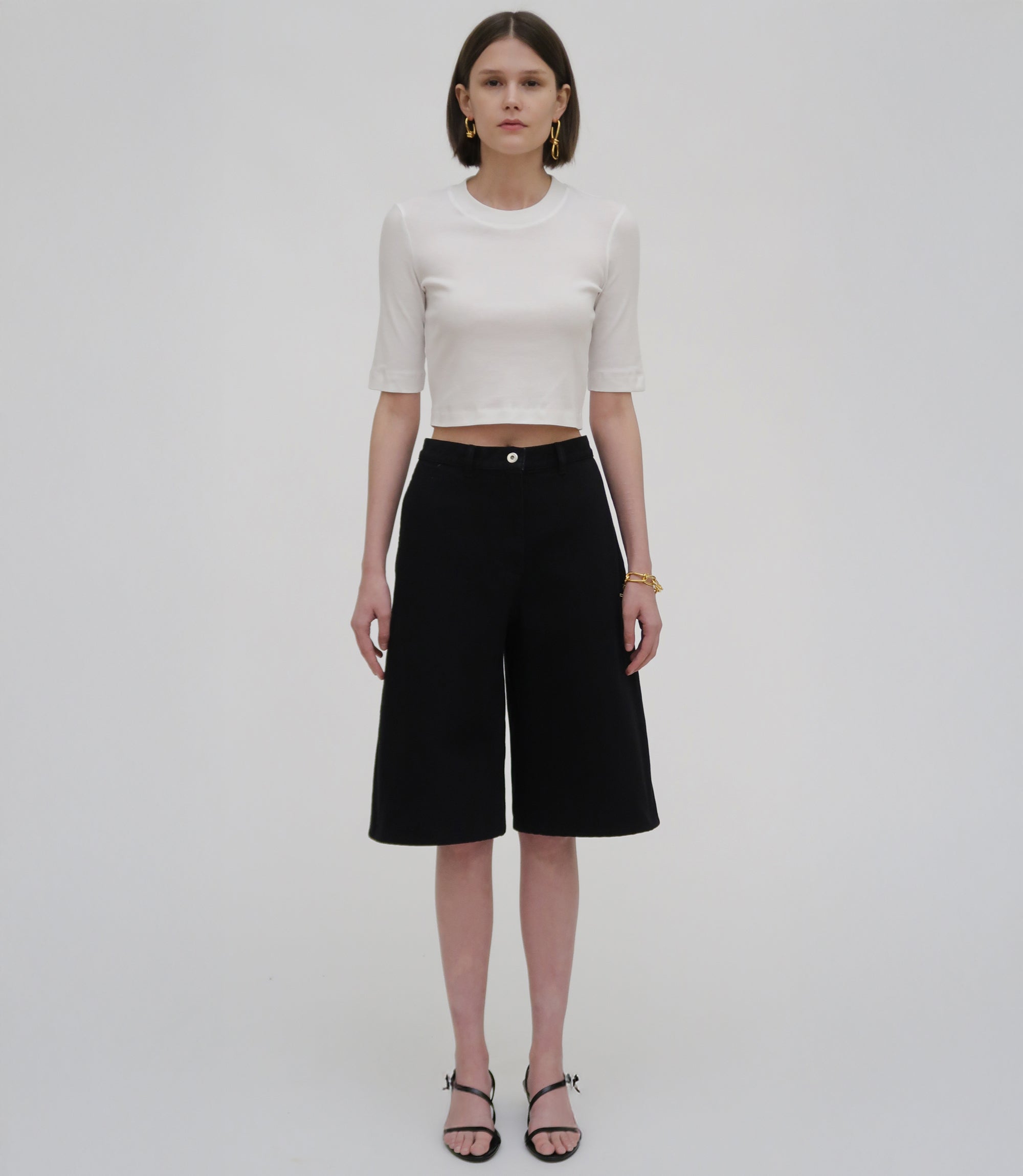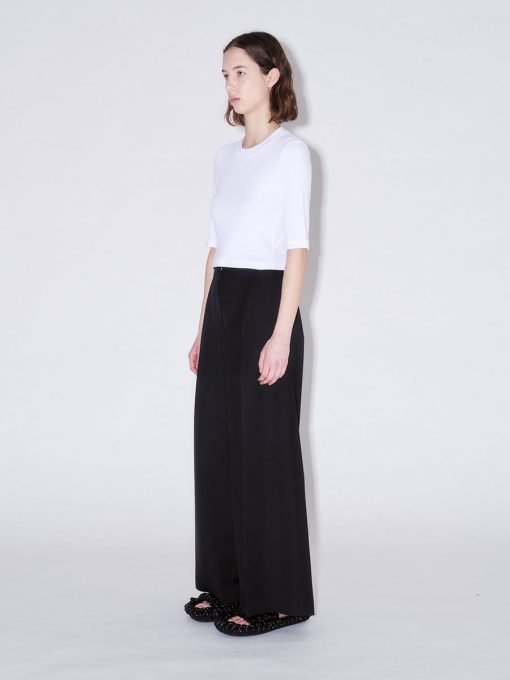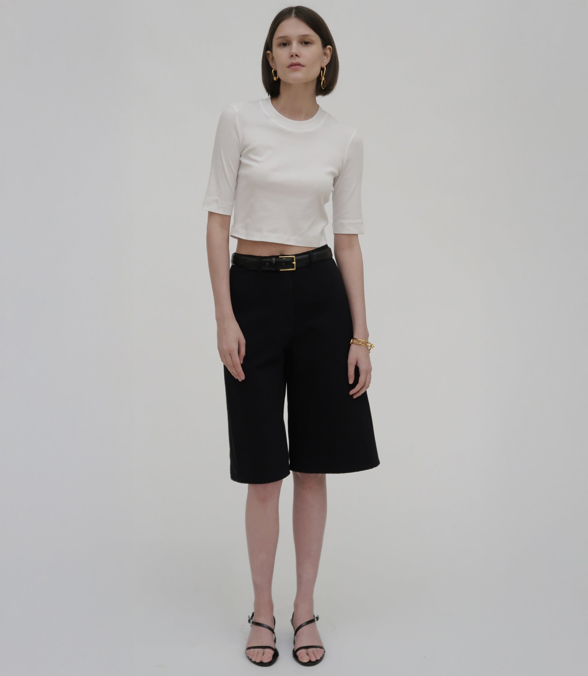 Hitting just above the hip, the slightly cropped shape of this essential crewneck tee offers perfect pairing with high-waisted bottoms. Cut from our exceptionally soft Mercerized Cotton Jersey, it gently envelops the body, flattering and enhancing the silhouette.