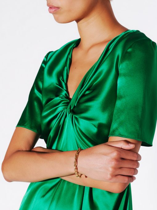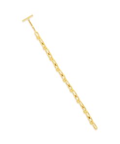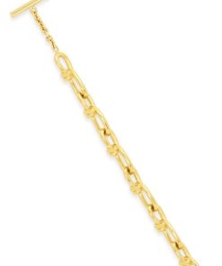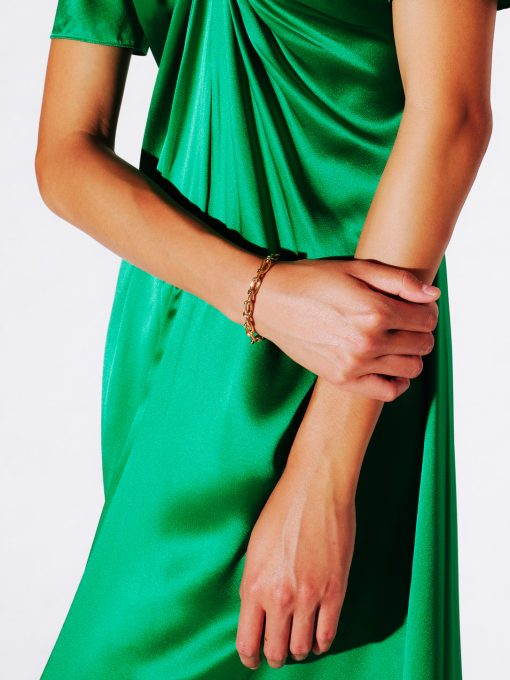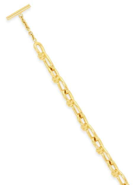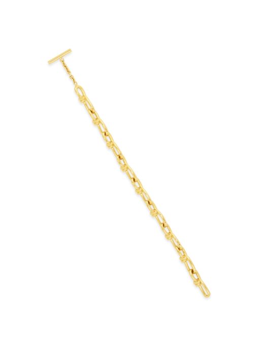 Rosetta Getty’s custom twisted chain features in a new slimmer shape for Spring 23. Designed with radiant 14K gold plating, the durable brass bracelet encircles the wrist with glittery textural links and a bespoke toggle closure, engraved with a subtle Rosetta Getty signature.