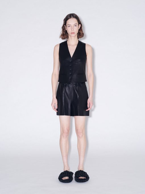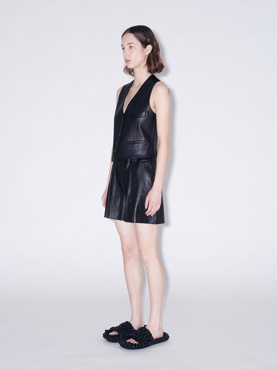 A hero style from our Spring/Summer 2021 collection, this sharply tailored sleeveless vest is crafted from our coveted stretch plongé leather and comprises a button-up fastening and subtle front pocket. In our seasonal campaign, this piece was paired with the matching pintuck shorts.