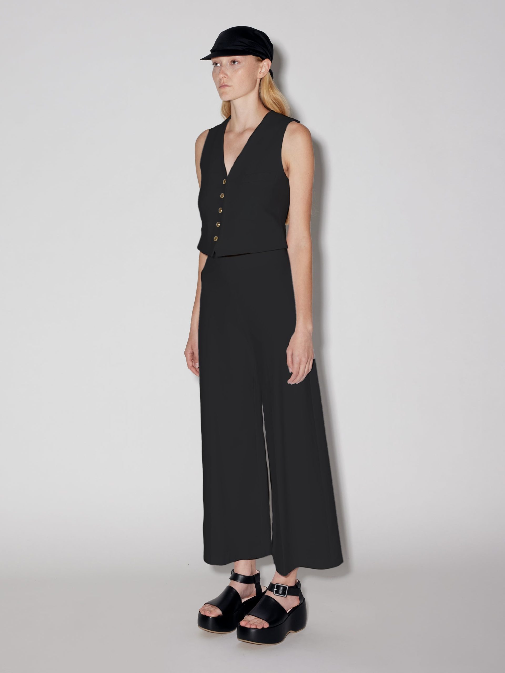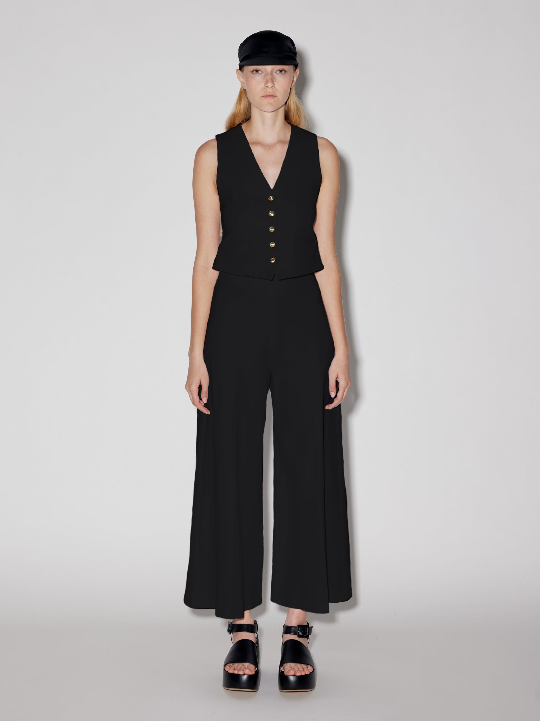 A timeless style, our Tailored Vest offers a complete suiting wardrobe in tandem with the other seasonal Rosetta Getty Interlock styles. A row of signature goldtone buttons centers the silhouette, while shaping darts sculpt the silhouette.