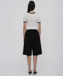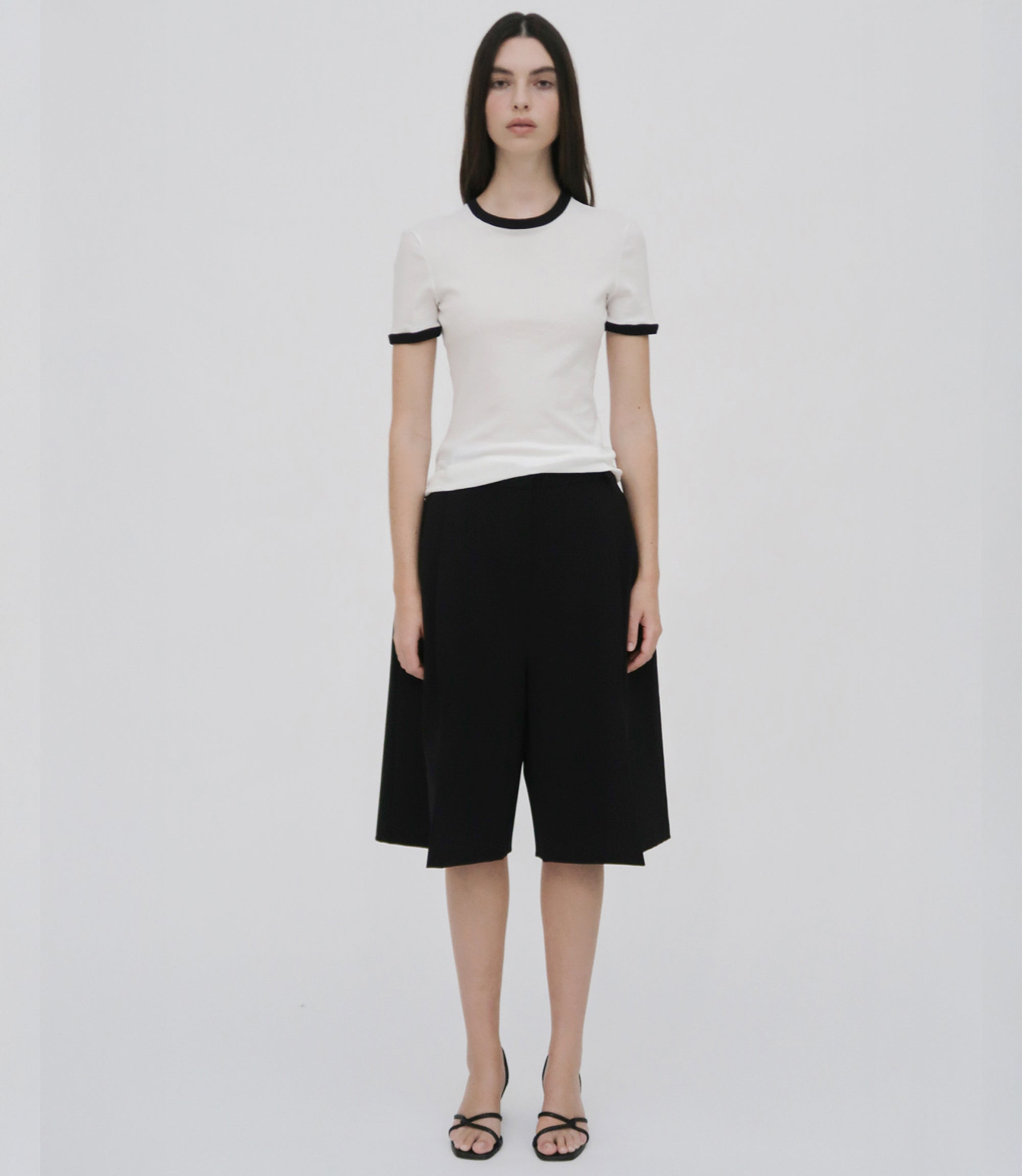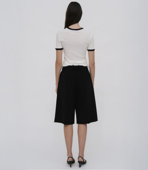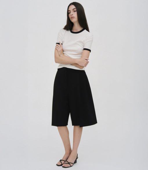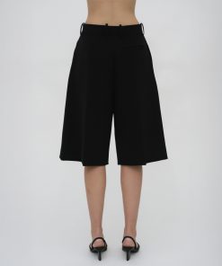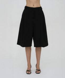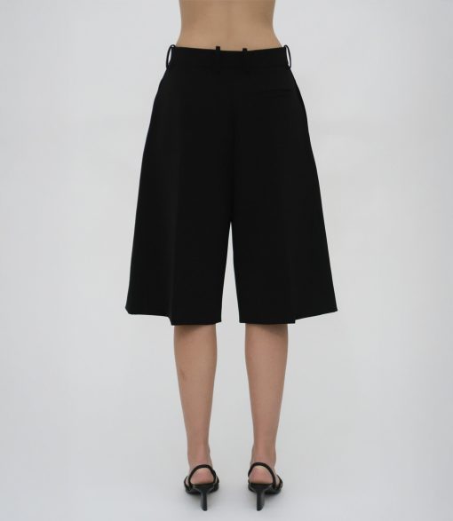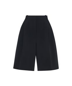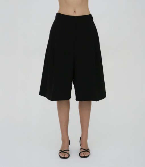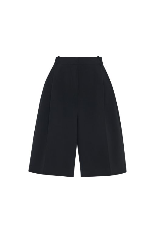 Our seasonal short silhouette flows from waist to hem with a skirt-like effect. Shaped by an exaggerated front pleat, the Cady Suiting fabric has a utilitarian sensibility that is a perfect partner for the below-the-knee-length short.